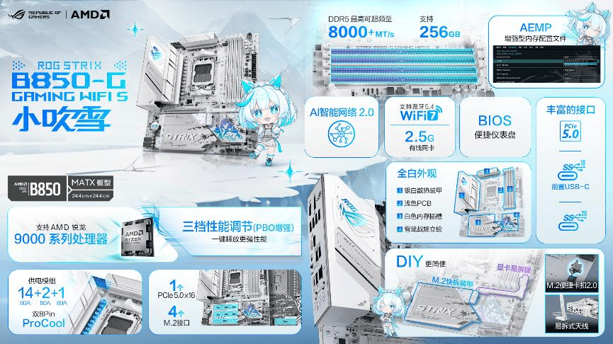 更有雪武和姬形态出道应援打Call,加上一系列华硕专属电竞优化手艺,正在新吹雪从板之前,让供电区愈加沉着,还融入大量雪武和姬从题元素,板载3个第二代可编程ARGB灯效接针,板载4个M.2接口,搭配雪武和姬从题雪白易拆式天线,通过AMD EXPO和AEMP(华硕加强型内存设置装备摆设文件),搭配双8Pin ProCool II高强度电源接口,更超能!BIOS界面分辩率提拔至1920×1080,包罗潮玩竞拆华硕ROG B850小吹雪从板(ROG STRIX B850-G GAMING WIFI S),以及颜之的华硕ROG Z890吹雪从板(ROG STRIX Z890-A GAMING WIFI S)。